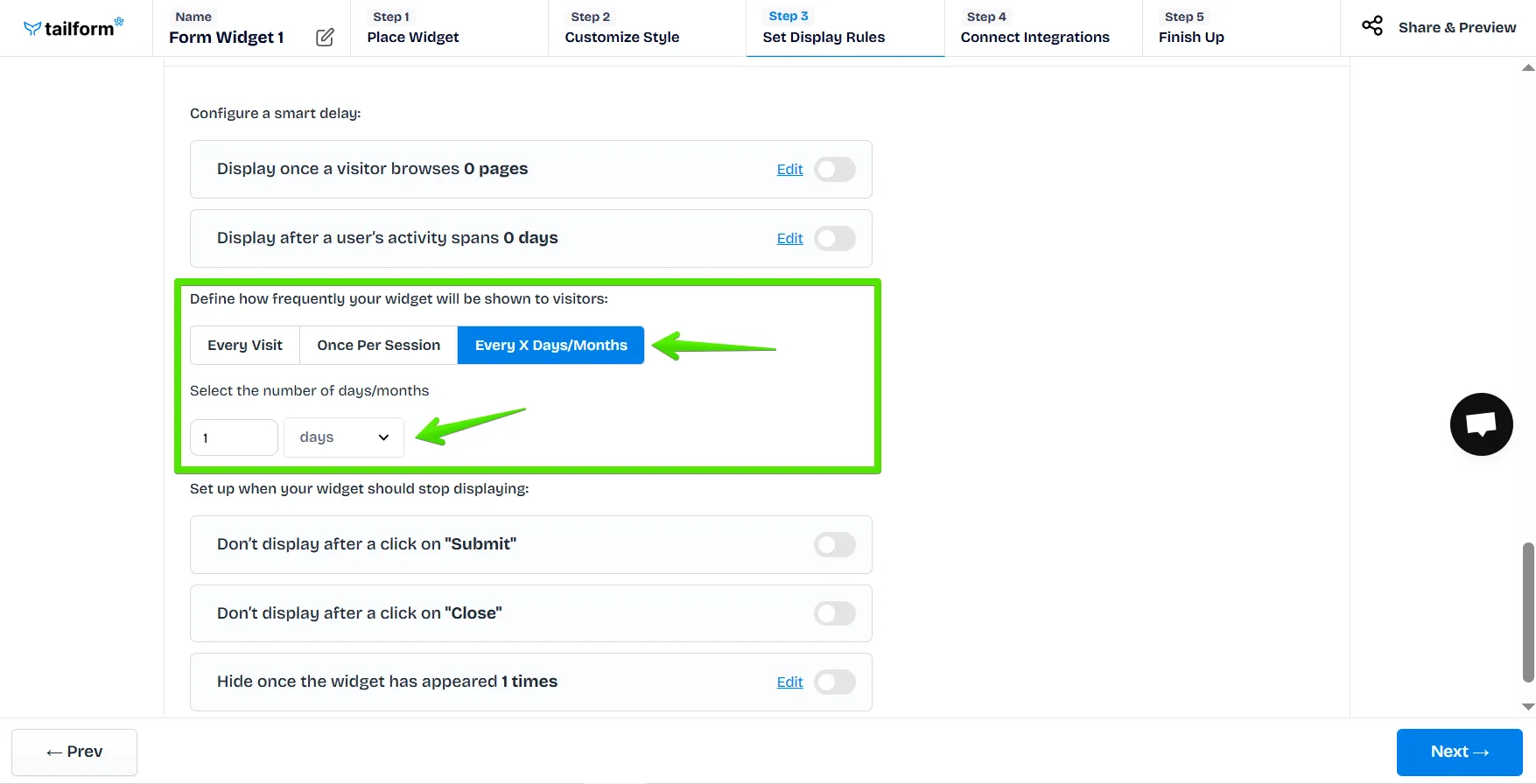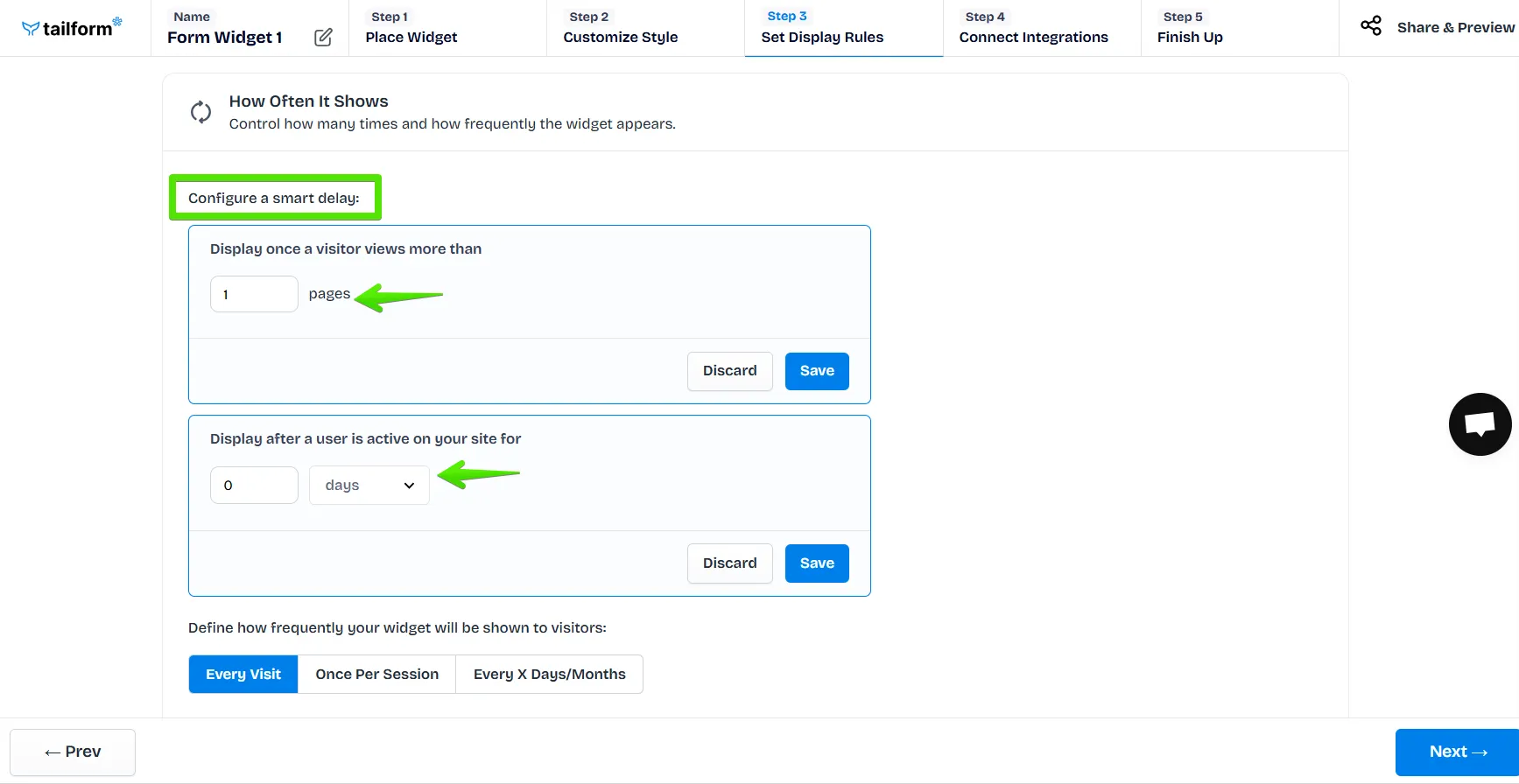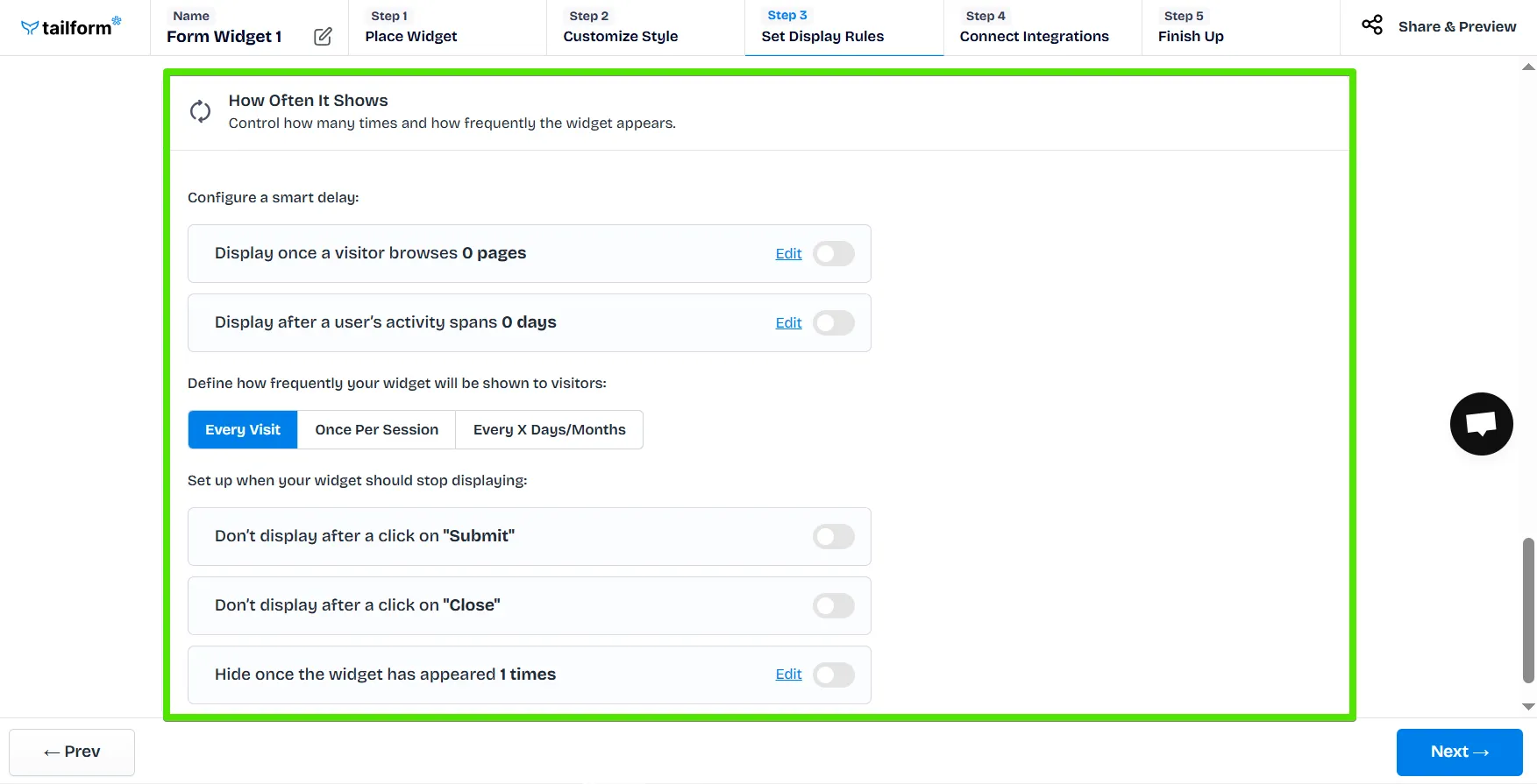 - Every Visit – Widget appears every time the visitor comes to the site.