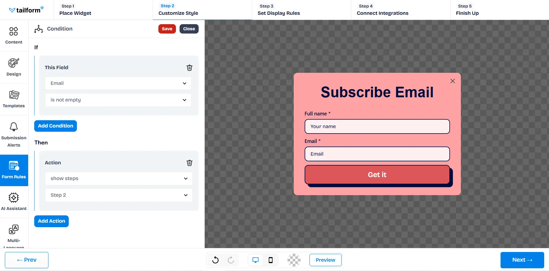 The Form Rules feature allows you to build dynamic, personalized user flows by setting conditional logic based on user responses.